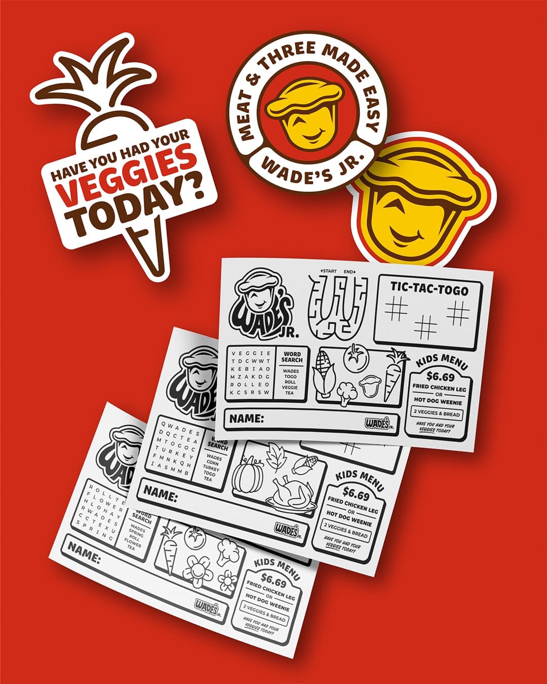 ADG designed the complete brand identity and marketing collateral system for Wade’s Jr., starting with a modernized illustration of their signature yeast roll character – cleaned up, energized, and given a “Jr.” personality that feels like the natural offspring of the original. We extended that identity across every customer touchpoint: packaging, apparel, kids’ menus, environmental signage, billboards, and retail collateral. The result is a system that launched a new restaurant while feeling immediately familiar to anyone who knows the Wade’s name.