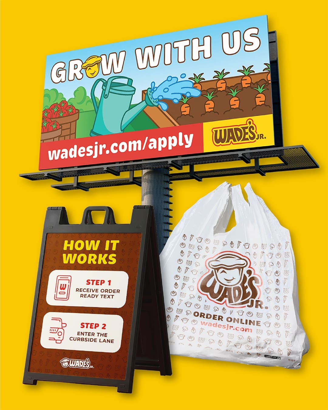 The collateral suite covers the full customer journey. We designed branded cups, to-go bags, and packaging; kids’ activity menus with seasonal themes; curbside pickup signage explaining the two-step order process; comment cards and feedback collateral; recruitment billboards driving applicants to wadesjr.com/apply; and apparel in multiple colorways featuring both a building illustration and the badge mark. Every piece was built to work together – so whether a customer is seeing the brand on a billboard on Reidville Road or pulling away from the curbside lane with a bag in hand, the experience is consistent.